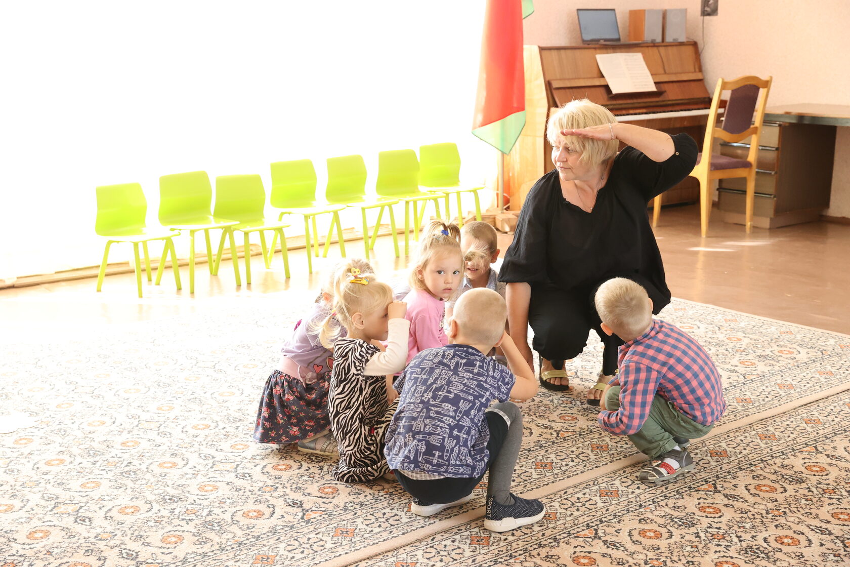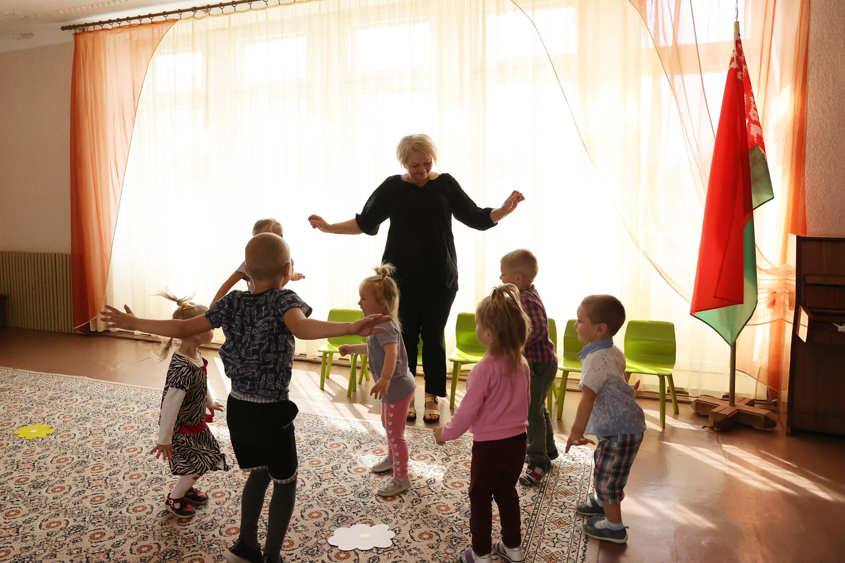 ...Как только Елена Бернардовна заглянула в группу и позвала ребят в музыкальный зал, те сразу оживилась. В приподнятом настроении все семеро дружно потопали за ней. Зайдя в зал, устланный мягким ковром с предусмотрительно разбросанными цветиками-семицветиками, уселись на стульчики. С каждой секундой заряжаясь веселым настроением, разливающимся вместе с музыкой по залу, стали притопывать, прихлопывать.