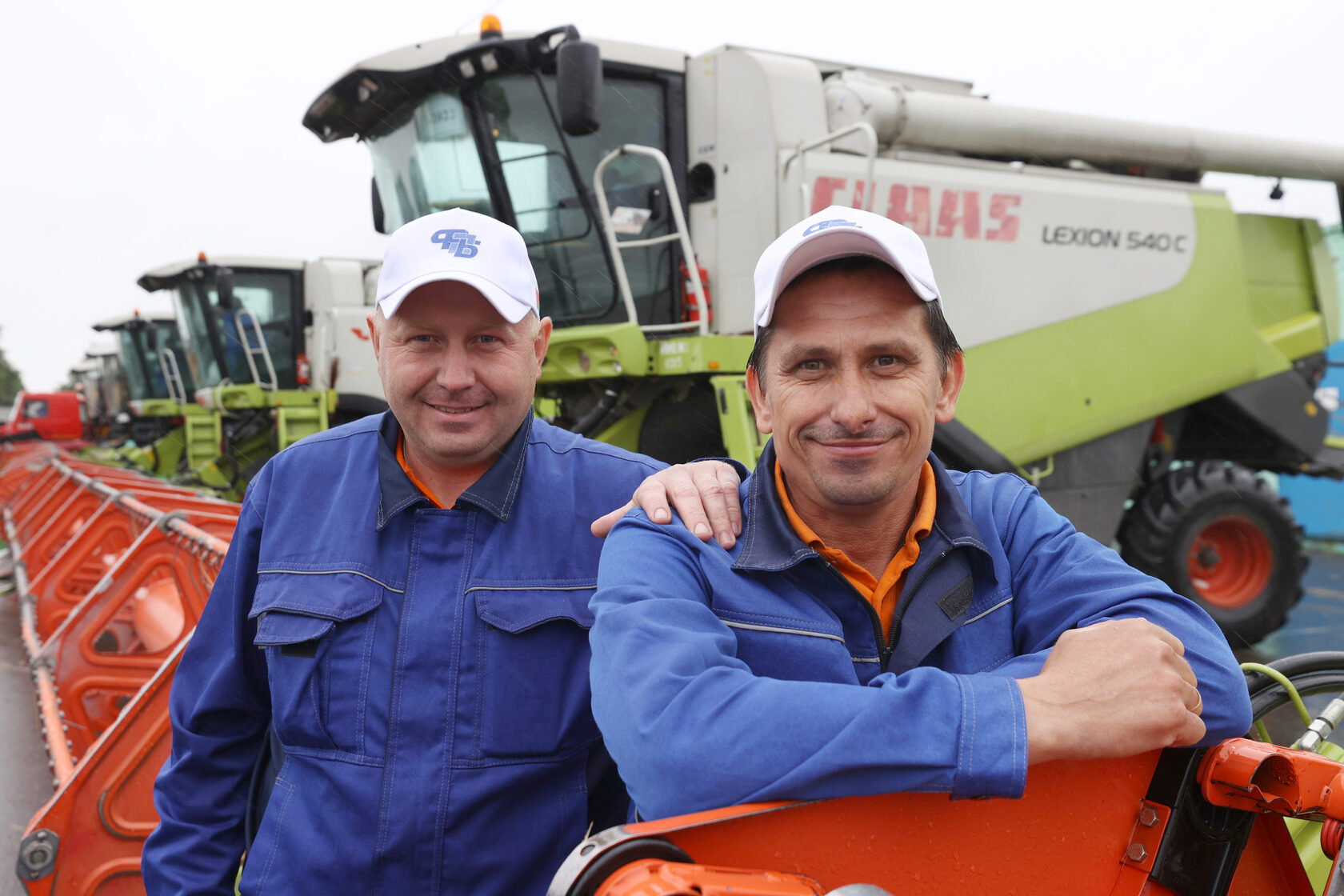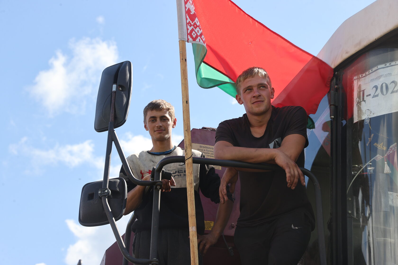 Комбайнер Михаил Лавринович и помощник комбайнера Максим Славинский. Бобруйский район